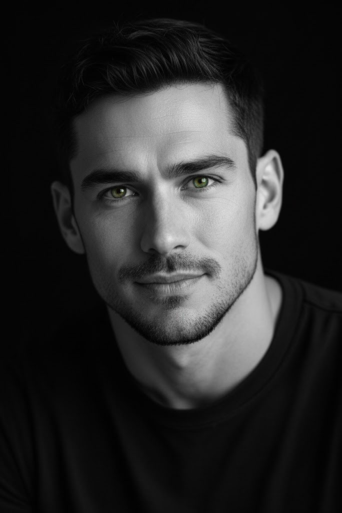 Retrato artístico hiper-realista em preto e branco, destacando um homem com barba e expressão contemplativa. A iluminação dramática de cima cria um intenso jogo de luz e sombra. Apenas os olhos mantêm a cor, um verde intenso, contra o fundo preto, criando uma atmosfera cinematográfica.
