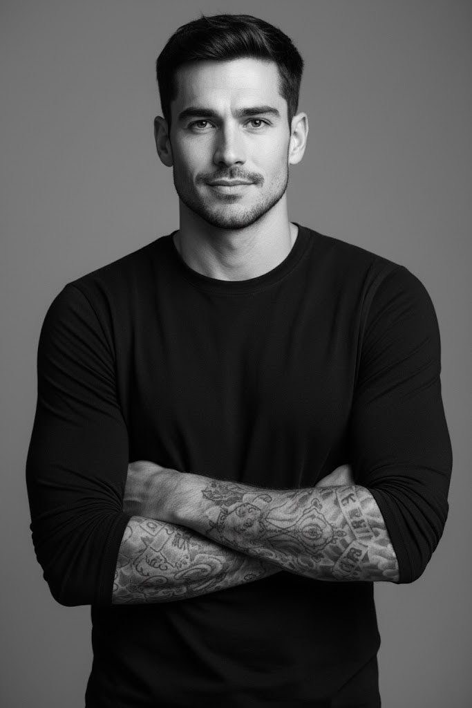 Retrato editorial 8K em preto e branco de um homem confiante com barba curta e cabelo penteado para trás. Ele veste camiseta escura ajustada, revelando tatuagens nos antebraços. O fundo cinza minimalista destaca sua expressão e estilo refinado.
