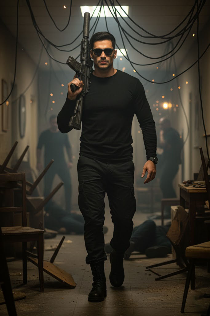 Imagem 8K hiper-realista de um homem robusto e intenso, todo de preto e com óculos escuros, caminhando confiantemente por um corredor sombrio e caótico. Ele carrega uma arma grande no ombro, em uma cena com atmosfera de tensão cinematográfica, fumaça e luzes quentes.