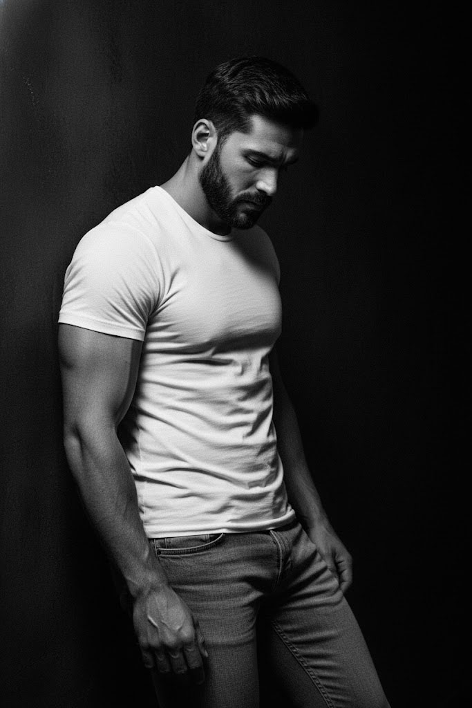 Retrato de estúdio cinematográfico em preto e branco de um homem musculoso e barbudo, com ar introspectivo. Vestindo camiseta branca justa e jeans, sua pose contra uma parede escura, sob iluminação lateral intensa, destaca texturas e veias, evocando força e vulnerabilidade.