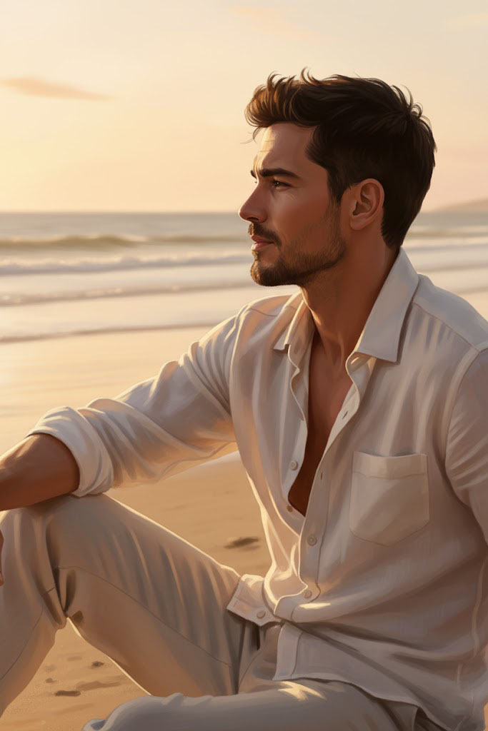 Imagem 8K ultra-realista e poética de uma pessoa de perfil na praia ao entardecer. Com expressão contemplativa, suas roupas de linho são movidas pelo vento. A luz dourada do pôr do sol reflete na areia úmida e na água, criando uma atmosfera cinematográfica e introspectiva.