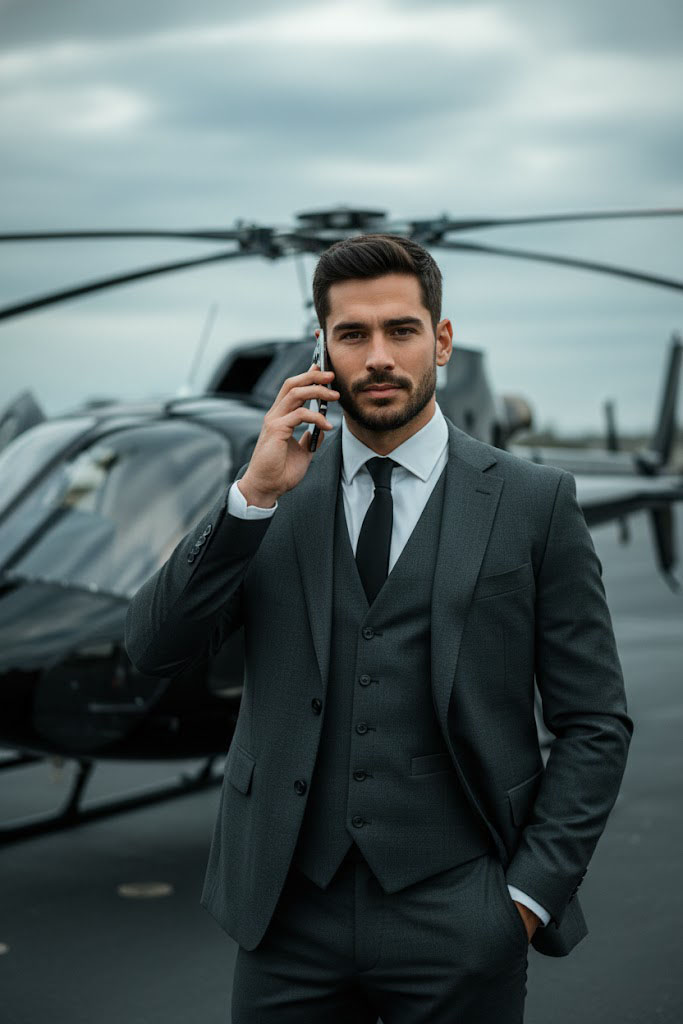 Retrato cinematográfico e hiper-realista de um homem elegante e confiante. Com terno de três peças, ele segura um iPhone ao lado de um helicóptero preto de luxo. A cena, sob céu nublado e iluminação difusa, transmite uma atmosfera dramática e editorial de luxo.