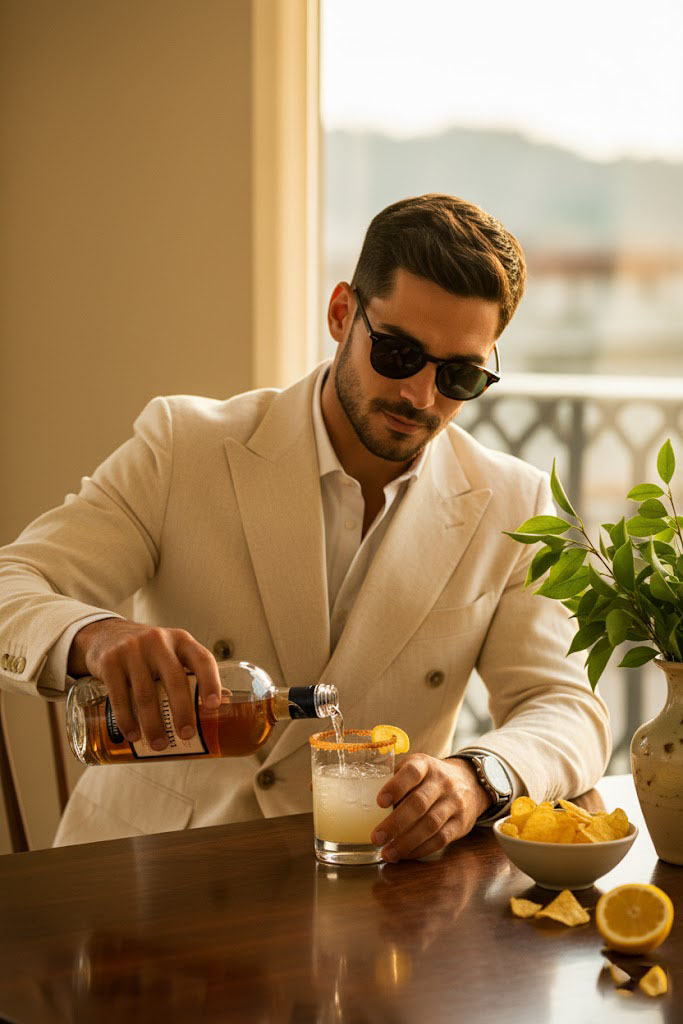 Imagem hiper-realista de um homem elegante ao pôr do sol. Com barba, óculos escuros e blazer de linho creme, ele serve um coquetel em uma mesa de madeira. A cena, com garrafa premium, chips e limões, tem iluminação dourada e uma atmosfera de lifestyle editorial.