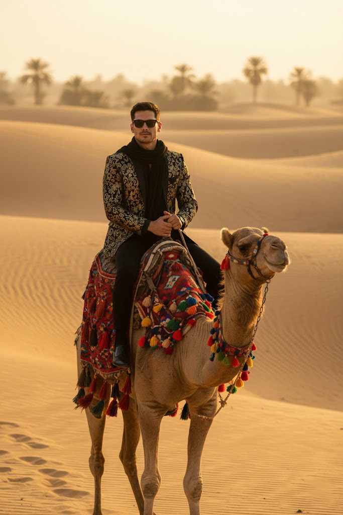 Imagem hiper-realista 8K de um homem em um camelo decorado, cruzando um deserto dourado ao pôr do sol. Ele veste um traje preto tradicional com detalhes dourados e óculos escuros. A luz quente e a brisa suave criam uma cena cinematográfica e exótica.