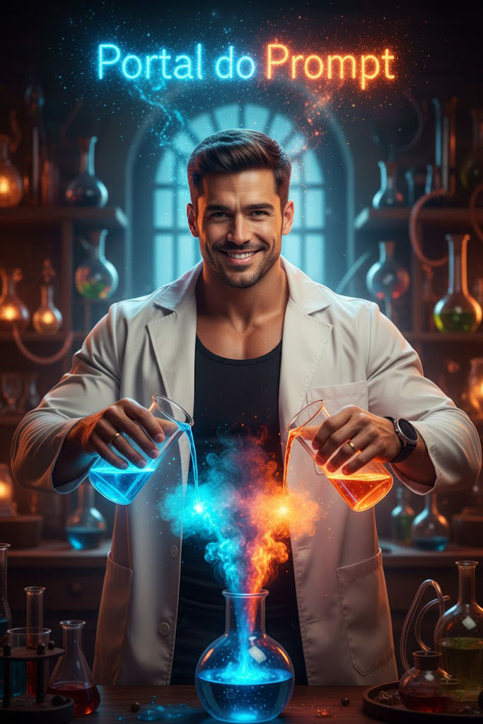 Retrato 8K hiper-realista de um homem musculoso em um laboratório místico. Com jaleco branco aberto e regata preta, ele mistura líquidos neon azul e laranja em um béquer, de onde sai fumaça mágica. A fumaça forma a frase "Portal do Prompt" em uma atmosfera cinematográfica.