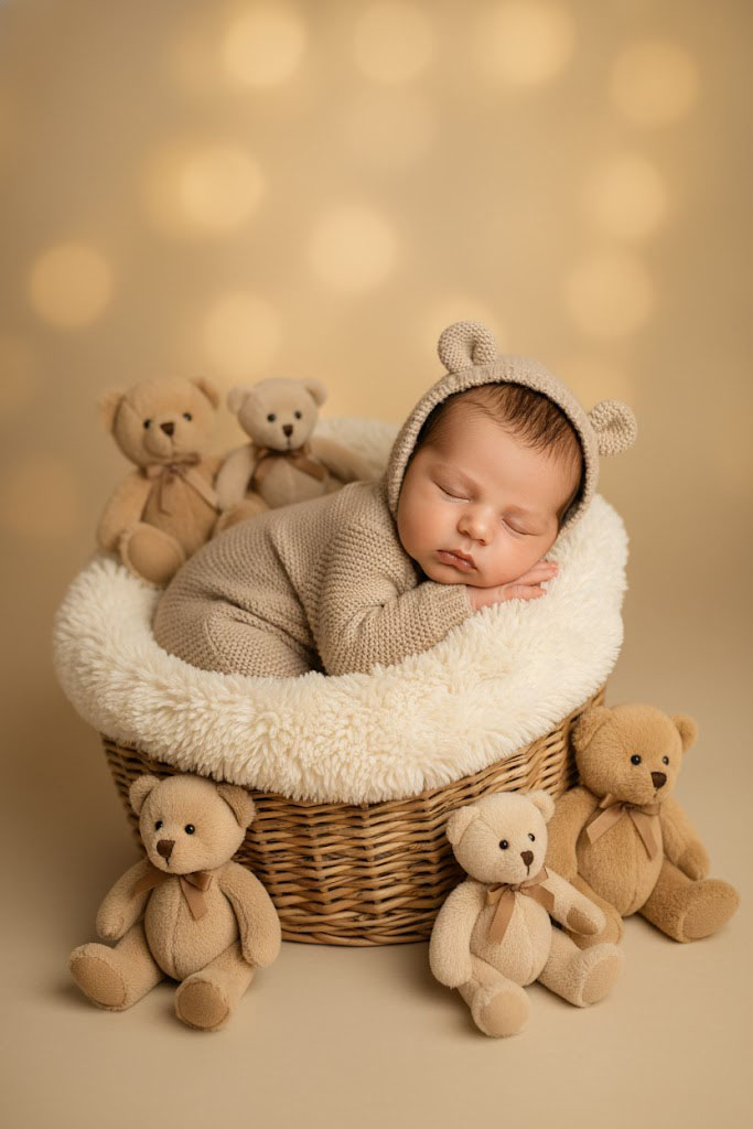 Crie uma imagem hiper-realista de um bebê recém-nascido dormindo. Ele veste um macacão de ursinho de tricô com orelhas e está em uma cesta fofa, cercado por ursinhos de pelúcia. A cena usa tons neutros (bege, creme, marrom) e iluminação suave. Estilo ensaio newborn profissional.