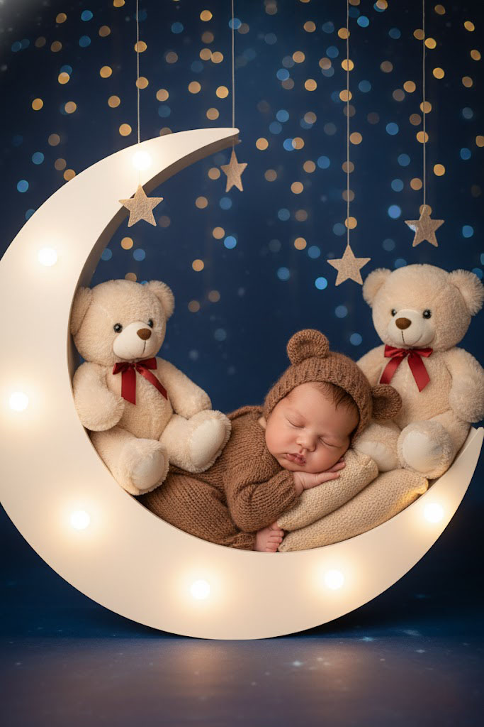 Crie uma foto de estúdio hiper-realista de um bebê recém-nascido dormindo. Ele veste um gorro de orelhas de urso e conjunto de tricô marrom, deitado em uma lua crescente iluminada. A cena tem fundo azul profundo com estrelas, e dois ursos de pelúcia grandes ao lado.