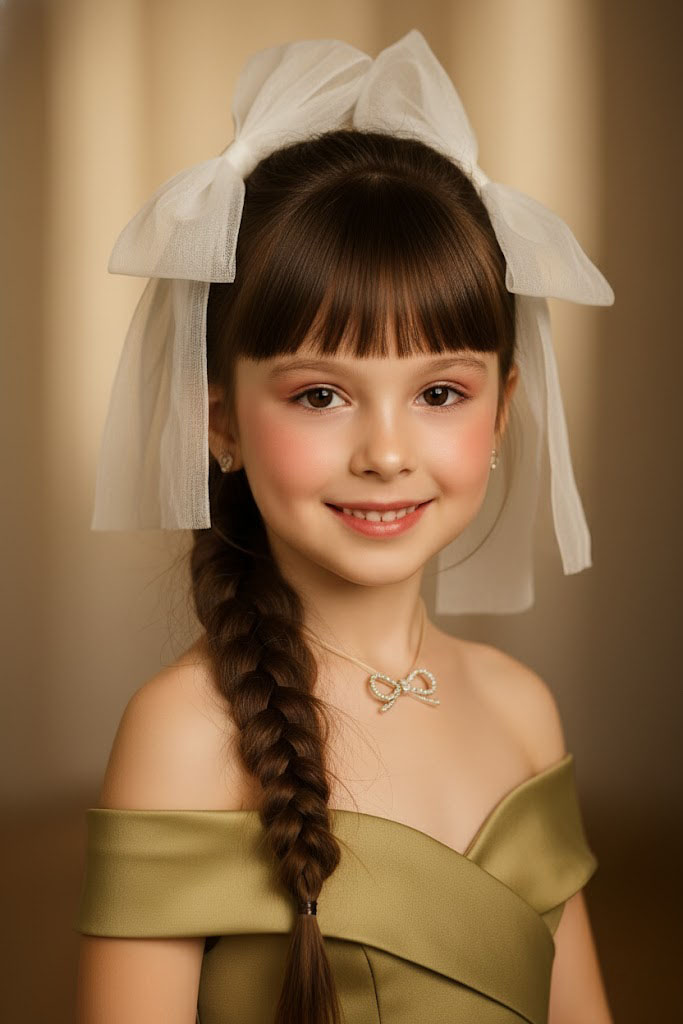 Crie um retrato de estúdio hiper-realista de uma menina de 4 anos. Ela usa maquiagem estilo coreano, cabelo em trança e rabo de cavalo com laços de gaze branca. Veste um vestido de luxo cáqui-amarelado com ombros à mostra. A iluminação é cinematográfica e quente.