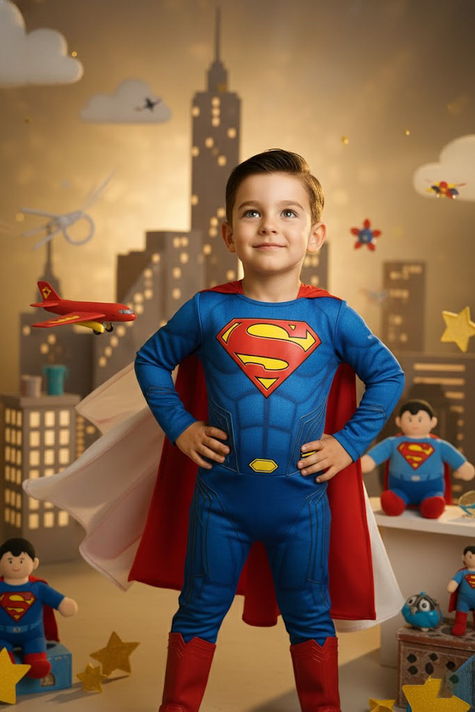 Crie uma imagem hiper-realista de um menino de 4 anos como Superman. Ele posa com as mãos na cintura e a capa esvoaçando, em um estúdio temático de Metrópolis com prédios e nuvens. A cena é alegre, heroica e cinematográfica.
