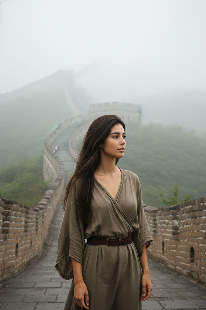 Um retrato realista e atmosférico de uma mulher em pé sobre a Grande Muralha da China, capturada em meio à névoa suave e luz natural difusa. A cena combina introspecção, beleza e grandeza histórica com total fidelidade facial.