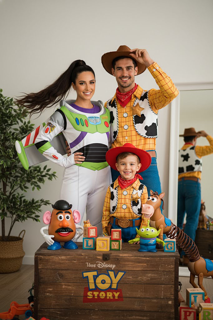 Uma família de três pessoas posa em trajes inspirados em Toy Story, cercada por uma ambientação temática com adereços e brinquedos icônicos. A cena combina realismo fotográfico, cor vibrante e emoção familiar.