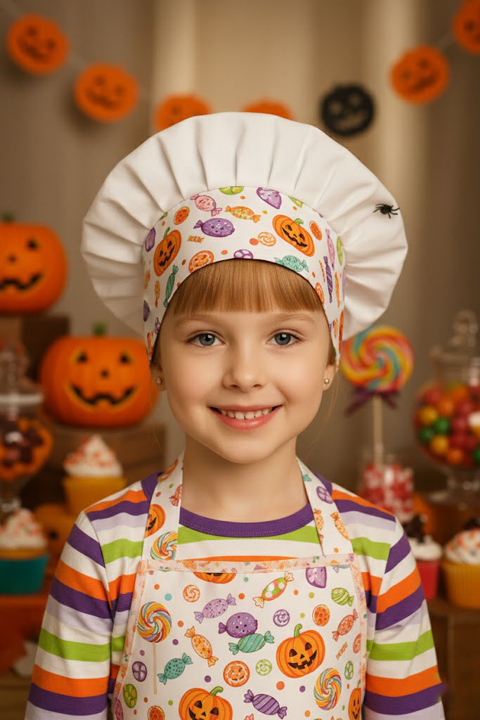 Uma fotografia artística e profissional de estúdio retratando uma menina de 3 anos como uma pequena chef de doces de Halloween. O cenário combina doçura, fantasia e o espírito festivo do Dia das Bruxas, mantendo total fidelidade facial.