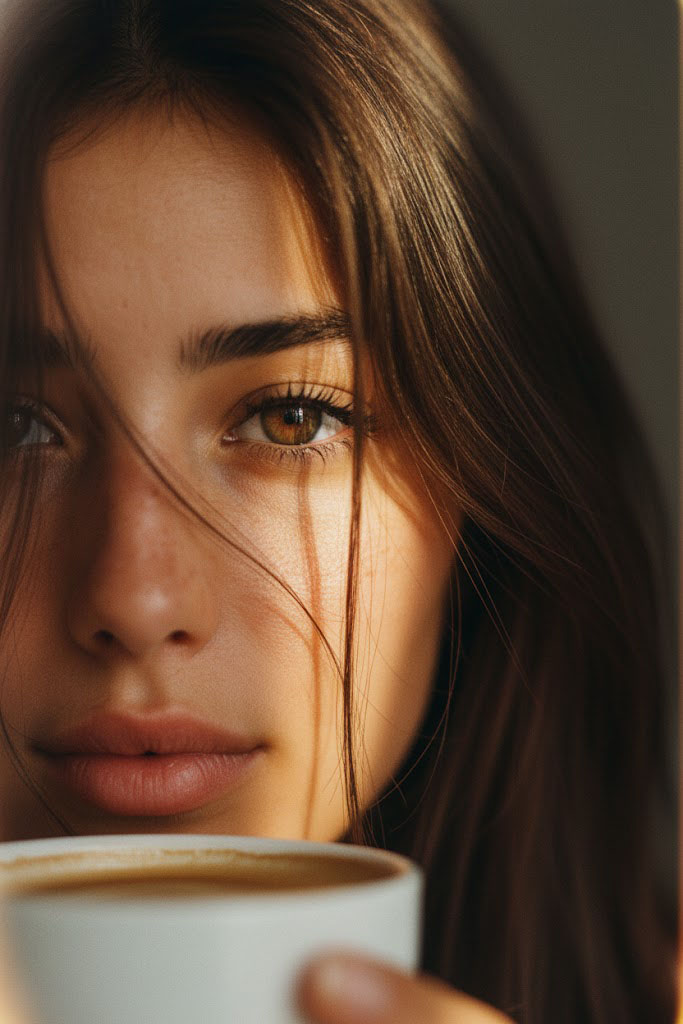 Retrato cru, íntimo e artístico com estética de fotografia analógica. A cena foca em um olho parcialmente coberto por cabelo, capturando o reflexo de uma xícara de café. A imagem usa grão de filme, fugas de luz douradas e tons terrosos para criar uma atmosfera nostálgica.
