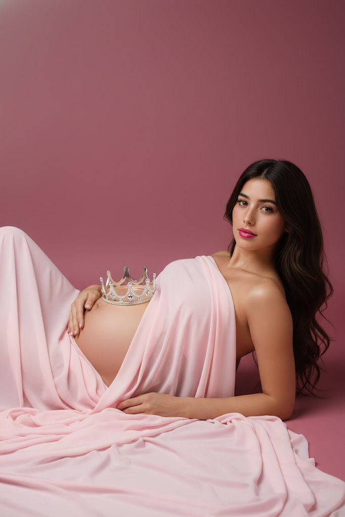 Um retrato de maternidade hiper-realista e poético, mostrando uma gestante envolta em tecido rosa pastel e coroada simbolicamente. A luz suave e o fundo em tons rosados criam uma atmosfera etérea que celebra a feminilidade e a beleza serena da gravidez.